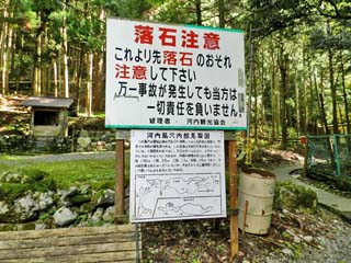 料金所近くにある「注意看板」。 「エチガ谷」に沿った道は狭く、「河内の風穴」の入口 近くは傾斜の急な石段となる。