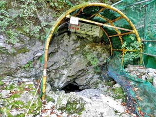 「河内の風穴」入口。 風穴入口の高さは1m程しかない。おまけに下り坂になっており、頭と足下に要注意である。