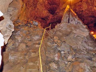 「大広間」から更に奥を撮る。 見学通路の手すりは、上へと向かう。 写真は、フラッシュを使用。フラッシュの光が届く範囲は、