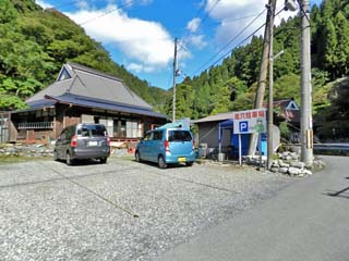 写真左の駐車場は有料で、普通車40台程のスペースがある。(写真は、帰りに撮影) 写真右の橋を渡った対岸には「河内の風穴」の案内板と、料金所がある。