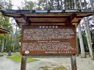 2012/3/23(13:23,13:26) 「壇上伽藍(だんじょうがらん)」の入口と「高野山の草創」の案内板。 「壇上伽藍」は、「奥之院」と共に高野山の二大聖地といわれ、「弘法大師御廟」を、 信仰の源泉に、「壇上伽藍」は、修学の場所として、「真言密教」の教えと伝統を今日に伝える。 また、高野山を開創された折、大師が実際に土を踏みしめ、塔、お堂の建立に心血を注がれたのが、 「壇上伽藍」であったという。 「壇上伽藍」を頭として、「蓮花院(金剛峯寺の東側)」までの形が、「龍」が臥している形に 似るといわれるが、この時、左写真の道が「龍」のお腹の位置にあたることから、 この道が、「蛇腹路(じゃばらみち)」と呼ばれる。 この「蛇腹路」を入った先に「高野山の草創」と書かれた案内板がある。 右の写真をクリックすると、「高野山の草創」の案内板が拡大表示(800x450)されます。