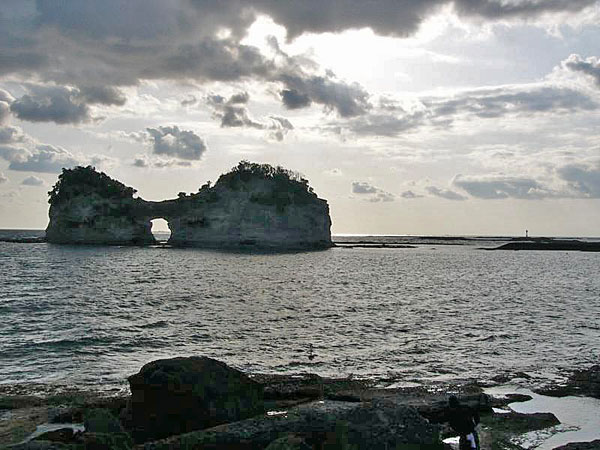 グラスボート乗場付近から見る「円月島」。 「四双島灯台」は、右に小さく見えている。