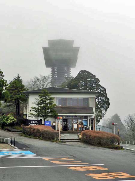 2019/4/25(9:17) 「ごまさんスカイタワー」。 写真は、国道371号「高野龍神スカイライン」から撮影。 護摩木を積み上げた独特の形をした展望塔の高さは33m。 定員15名のエレベーターも設置されており、 展望塔(有料)の上からは、四季折々の風景が楽しめる他、 大台ヶ原や大峰の山々を始め、展望に恵まれれば、 四国の山々までを望むこともできるという。 |
