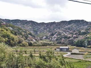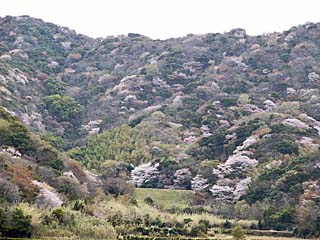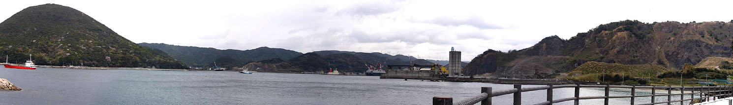 | 2011/4/8(10:31) 「柏ビーチ」駐車場で見る東側の景色。 左の山が「重山(標高262m)」で、上の写真の右からつながる。 「重山」の右方向には「由良港」があるのだが、手前の陸地が邪魔して奥まで見えない。 注:写真は、横が1,490ピクセルあります。写真直下にあるスクロールバーをご利用ください。 |