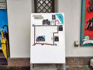 「徐福ゆかりの地」周遊ルート。 案内板には、七人の重臣を祀る「秦徐福重臣碑 (重臣の墓)」や上陸の地「蓬莱山」にある、 「阿須賀神社(徐福の宮)」、「徐福上陸の碑」と 徐福ゆかりの場所を徒歩で巡る、一周18分程の 周遊ルートが書かれている。