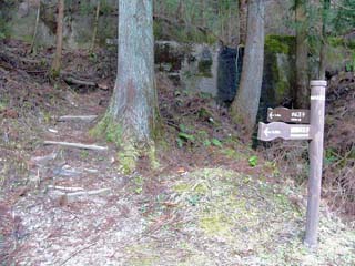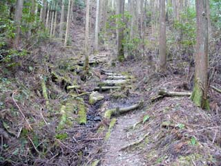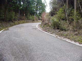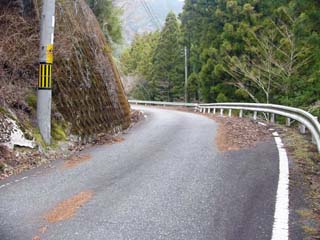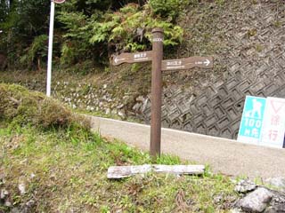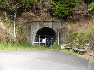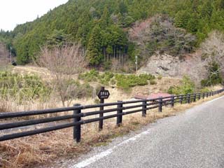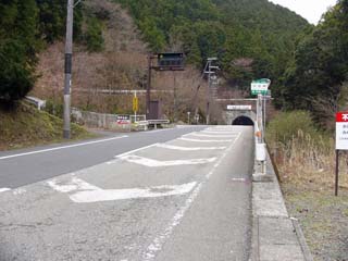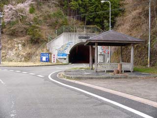 2011/4/7(7:47) バスは、7時38分「小広峠」に到着。 写真左に写る電信柱の横を入り、トンネルの上に 見えるガードレールの道に向かう。 なお、「熊野古道」は、熊野三山(熊野本宮 大社、熊野速玉大社、熊野那智大社)へと通じる 参詣道の総称であり、熊野三山に向けて歩く人が 多い。今回は、これを逆向きに歩くことになる。