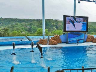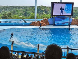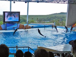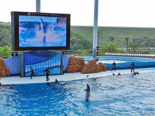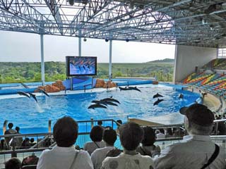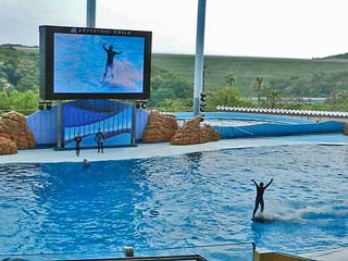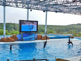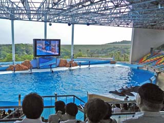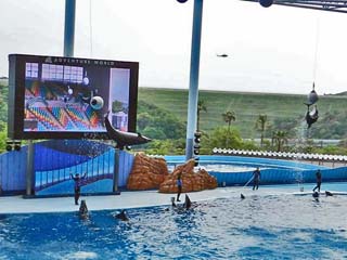 「イルカ」たちがパフォーマンスを繰り広げるマリンライブ「Smiles」は、 プールの大きさ、横47m、奥行き21m、深さ8m。収容人数3,687という