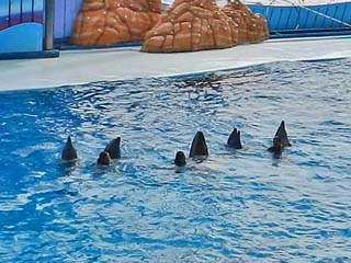 2019/4/25(14:25) 水上に頭を出す「イルカたち」。 この中には、3人のトレーナーの頭もある。 写真をクリックすると拡大写真(600x450)が 表示されます。 |