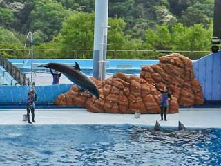 2019/4/25(14:22) トレーナーは、2頭の「イルカ」の頭を 撫でているようである。 写真をクリックすると拡大写真(600x450)が 表示されます。 |