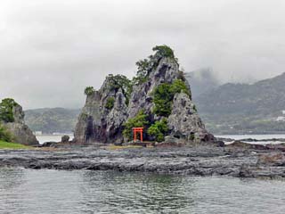 東牟婁郡那智勝浦町の海岸にある小島(岩山)で、島には赤い鳥居の「白蛇弁天」が祀られ、 潮が引くと歩いて島に渡ることもできる。