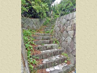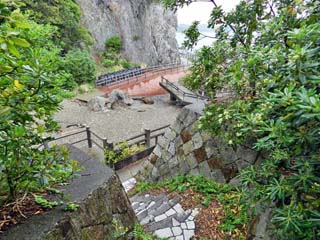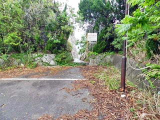 駐車場の端から見る「お蛇浦遊歩道」。 石段を下りた先に、寸断された遊歩道と、 その奥に、赤茶色の新しい遊歩道が見える。