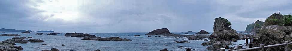 「お蛇浦遊歩道」から見る東側(熊野灘)の景色。 写真左に、「宇久井(うぐい)半島」。右に、「狼煙(のろし)山半島」。