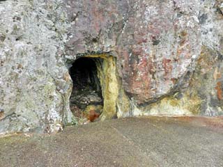 「お蛇浦遊歩道」の山側に掘られた「坑道跡」。 南紀熊野ジオパーク推進協議会発行の 「南紀熊野ジオパークの地質と地形」には、