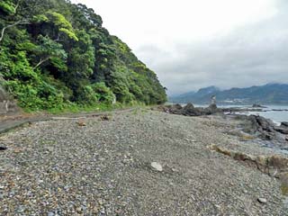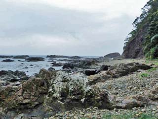 「駐車場」に戻る。 駐車場の東側には、広い「磯場」がある。 それに、旧遊歩道は、駐車場の東側へと続いていたのである。