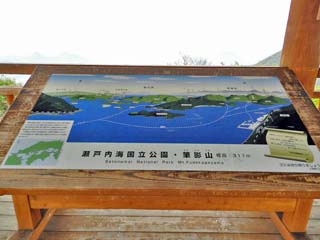 2013/4/17(7:46) 「筆影山」からの展望図。 展望図の左には、東方向にある「岩小島」と「向島」。 右には、南方向の「大島」。後には、四国の山々が 描かれている。 |