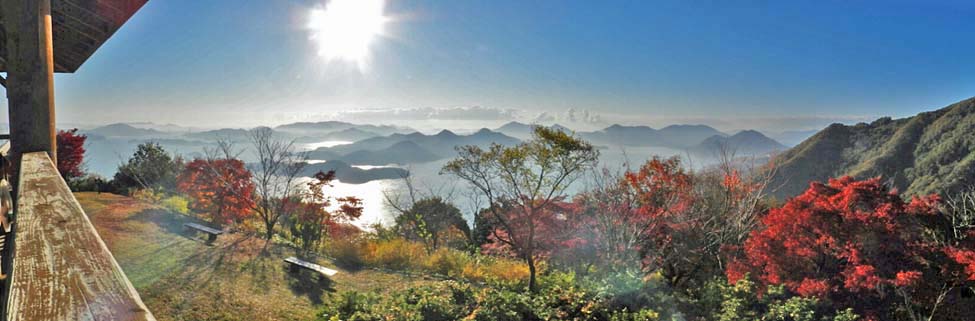 2013/11/23(8:14) 秋の晴れた日に「筆影山」展望台から見る景色。 「筆影山」では、晩秋から冬にかけて、晴れて冷え込んだ早朝には、幻想的な「海霧」が発生するため、写真撮影スポットとして全国に知られる。 この日、「筆影山」に登る前は多少の「海霧」が発生していたのだが、展望台に到着したときには、残念ながらそのほとんどは消えていた。 |