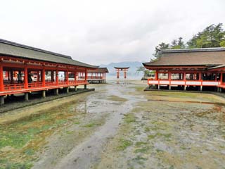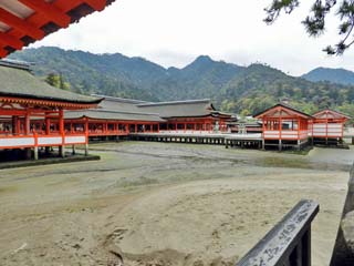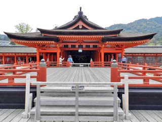 2013/4/18(10:05) 「参拝受付」付近で見る「嚴島神社」。 「嚴島神社」は、海に浮かぶ神社として知られるが、 これは、島全体を神として崇め、陸地では畏れ多いから といわれ、「原始宗教」のなごりだという。 |