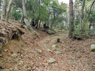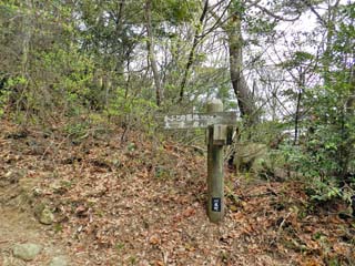 2013/4/17(11:12) 傾斜の緩い道と階段状の道を繰り返すと 「かぶと岩コース」に合流。 ここで、「岩海遊歩道」は終わり、この先は「かぶと岩 コース」を登る。 「かぶと岩コース」は、「どんどんコース」同様、「安芸 川尻駅」から「野呂山」に歩いて登るための登山道だが、 途中で「どんどんコース」から離れ、「岩海遊歩道」を 通らずに「かぶと岩展望台」へと直登する。 標識には「かぶと岩園地390m 大滑岩410m」とある。 |