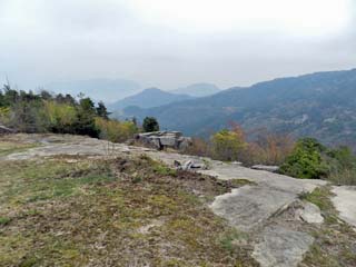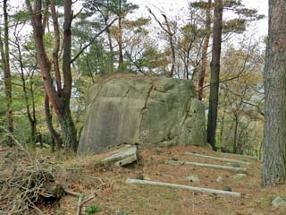 2013/4/17(11:42) すこし離れて見る「大滑岩」。 ここからは、「かぶと岩展望台」から400m下った地点に 直接行ける道があるのだが、道に自信が無かったため、 来た道を戻る。 |