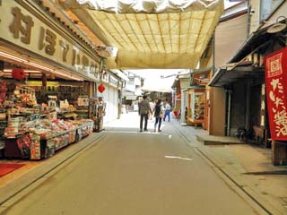 2013/4/18(12:07) 「表参道商店街(清盛通り)」。 「御笠浜」から「宮島桟橋」に戻る途中、海岸線から 山側に一本入った道が「表参道(清盛通り)」であり、 通りには、「土産物屋」や「食事処」が並ぶ「宮島」で 最も賑わう商店街である。 「世界一の大杓子」は、写真奥(宮島桟橋寄)に歩くと 左側にある。 |