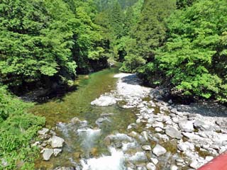 2016/5/18(9:55) 「長淵橋」の上から見る「柴木川」。 写真は、「柴木川」の上流方向で、この辺りは「長淵 (ながぶち)」と呼ばれ、昭和63年(1988)の大洪水 以前は、長く深い「淵」が続き、岩の飛び込み台も あったという。 現在も、川遊びの人気スポットとして知られ、 最近では、長さ100mの長い淵で「カヤック」を 楽しむ人が増えているという。 |