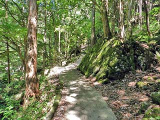 2016/5/18(10:40) 「石樋」沿いの遊歩道。 桟道は終り、通常の遊歩道に戻る。 「石樋」周辺の遊歩道では、聞き慣れない物音が あちらこちらから聞こえてくるので、調べてみると 「モリアオガエル」の鳴き声であった。 また、この日は、気付かなかったが、5~8月頃には、 「カジカガエル」の美声を聞くこともできるという。 |