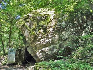 2016/5/18(9:59) 「狼石(おおかみいわ)」。 渓流の音が、この岩に反射・共鳴し、狼の遠吠えの ように聞こえるという。 大きさは、横に立つ看板から想像願います。 |