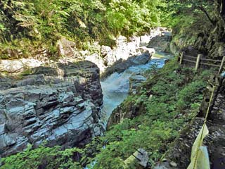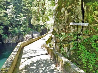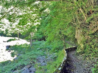 2016/5/18(10:33) 「女夫淵(めおとぶち)」の案内板付近にて。 岩に沿って造られた桟道が見えている。 写真をクリックすると「女夫淵」の案内板(600x450)が 表示されます。 |