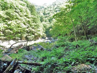 2016/5/18(10:03) 「寺が瀬」付近にて。 木々に阻まれ視界は良くないが、この辺りに「寺」が あったという。 また、付近には大人一人がすっぽりと入ってしまう 大きさの「甌穴(ポットホール)」を持つ、「からすばち」 という岩があるという。 |