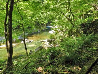 2016/5/18(10:33) 「女夫淵」の手前で見る「柴木川」の流れ。 「女夫淵」までは、静の渓谷が続いている。 |