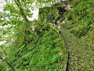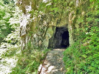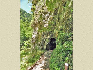 2016/5/18(10:30,10:30) 「庄兵衛岩」。 「庄兵衛岩」は、「五立」の中で一番大きな岩壁で、昭和30年(1955)代までは、ここにトンネルはなく、 岩を回り込むように橋が造られていたという。写真のトンネルは、その後掘られたもので、手掘りではなく、 近代の技術で掘られたというのだが、素人には「手掘りのトンネル」に見える。 右の写真をクリックするとトンネルの中で撮る写真(600x450)が表示されます。 |