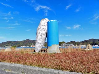 「球を包む幕舎/保田春彦」と「高根大橋」。 他の作品は、全て「生口島」の中にあるのだが、 この作品だけは、「高根大島」を渡った「高根島」にある。 |