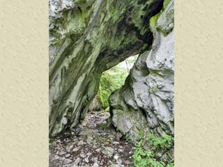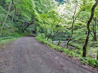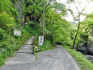 2016/5/19(8:57) 「唐門」の入口。 「唐門」は、「鬼の唐門」とも呼ばれる、高さ約8mの 天然橋で、写真左の細い道を入ると、20~30m程の 所にある。 写真をクリックすると「唐門」の案内板(600x450)が 表示されます。 |