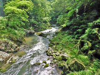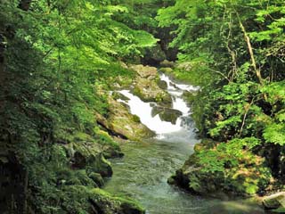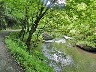 2016/5/19(9:34) 「断魚渓」に架かる橋の上から下流側を見る。 落差の大きな滝などはないが、流れは速い。 写真をクリックすると「断魚渓」の案内板(600x450)が 表示されます。 |
