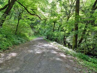 2016/5/19(9:14) 「マス養魚場」への道。 写真では、道幅が広く見えるが、車どうしでは、 離合できない場所が多い。 |