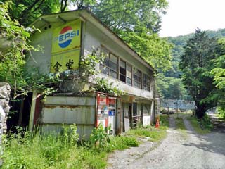 2016/5/19(9:40) トンネルを抜けたところで見る、廃業した食堂と、 「マス養魚場」のフェンス。 |