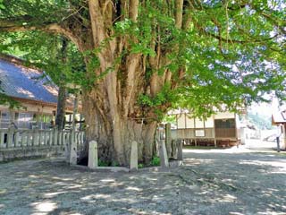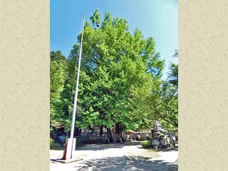 目通り幹周9.85m、根回り周囲10.6m、推定樹齢は1,100年を越えるといわれ、県の天然記念物に 指定されている大銀杏である。