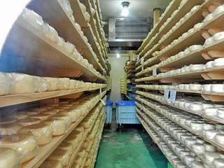 「熟成室の中(ガラス越し)」。 細かく区切られた棚には、熟成中の「ゴーダチーズ」が 整然と並べられている。