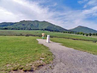 「育成牧場」と「上蒜山」。 建物の裏に回ると「育成牧場」があり、背景には 「蒜山三座」が並ぶ。 |