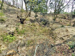 2013/4/16(12:01) 「第2水門跡」。 坂を下った右の石垣には、「水門(雨水を城外へ出す ための小さなトンネル)」の出口であろう穴(写真右上)が 見られた。 |
