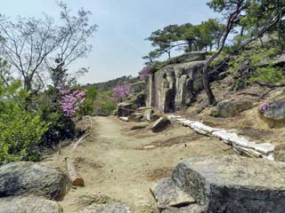 2013/4/16(11:54) 「南門」。 「大規模な掘立柱城門で、城門の中央には巨石を敷き 詰めた通路と、7段からなる階段が残っていた」とある。 写真をクリックすると「南門跡」の説明が 表示(800x600)されます。 |