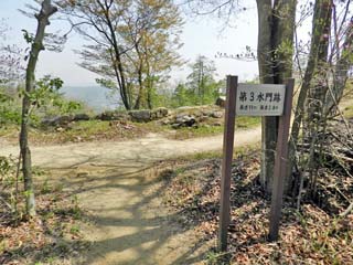2013/4/16(12:00) 標識には「第1・2水門」とある。 ここで、「城壁見学路」から離れ、左に坂を下り 「第1・2水門」に向かう。 「南門」から「第2水門跡」までの距離は、250m。 |