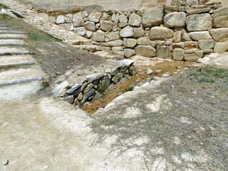 2013/4/16(11:28) 城壁の内側から見る「第5水門跡」。 「水門」とは、城壁が崩れないように、城内にたまった 雨水を外へ出すための施設で、石垣の上の部分に、 小さなトンネルのような形で造られているという。 従って、写真は城壁内側の排水溝の部分であろう。 城壁の内側には、城壁の外へとつながっていると 思われる穴が開いていた。 写真をクリックすると「城壁の内側の穴」が 表示(600x450)されます。 |