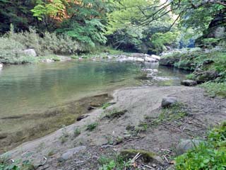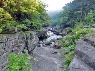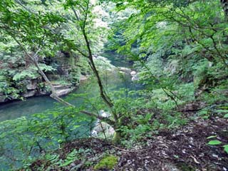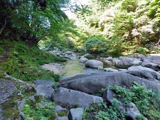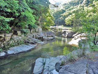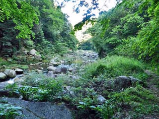 「臼渕」の方向を向いて撮る「奥津川」。 写真をクリックすると拡大写真(600x450)が 表示されます。 |