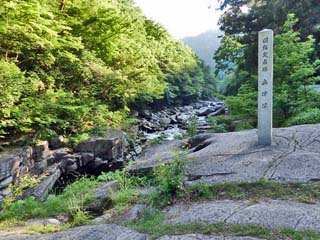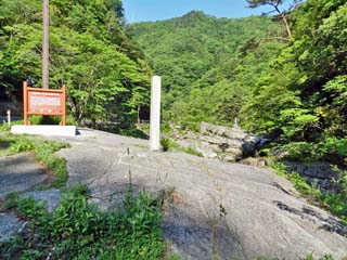 標柱には、「名称奥津渓」とある。 また、裏には「昭和7年 名勝地に指定」とあるので、 この標柱は、「奥津渓」が国の名勝に指定されたのを 記念して立てられたのであろう。 |