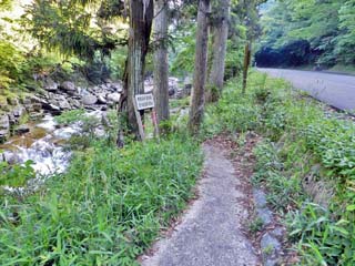 遊歩道の右に車道。左下に「奥津川」が流れる。 |