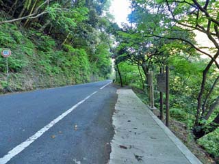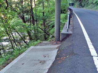 途中、車道に上がったところ。 往路、7時31分に通った場所で、この車道を歩くのは、 右の路肩が白くなっている短い距離だけである。 |