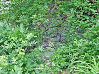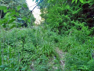 川辺を直進すると、道は草に覆われ、更に進むと木の枝が道を塞いでいたため、 ここで、来た道を戻る。 |
