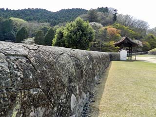 「石塀」。 元禄14年(1701)に完成。 閑谷学校の施設をすべて囲み、その全長は765mにも 及ぶという。 |