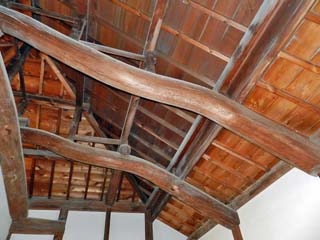 「習芸斎」の部屋上部。 天井を張らず、太い自然木の梁と屋根裏が見えている。 |